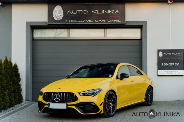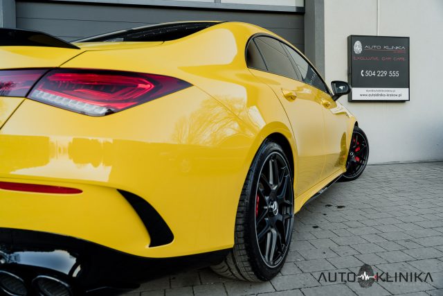 Możnaby również pomyśleć, że ogromny spojler jest elementem charakterystycznym dla wersji CLA 45 S. Otóż nie- jest to część pakietu aerodynamicznego AMG i można go domówić nawet do słabszego CLA 35. W jego skład wchodzą też dokładka do dyfuzora tylnego zderzaka i dodatkowe lotki na zderzaku z przodu. Wnętrze natomiast nie różni się projektem od zwykłej CLA, więc o jego charakterze decyduje gra detali. Jaskrawo żółte przeszycia, sportowa kierownica, czy sportowe fotele.